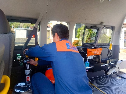 新しい車両は、令和7年12月3日に飯田広域消防高森消防署の審査を受けました。「南信州広域連合民間患者等搬送事業に対する指導及び認定に関する要綱」に従い、搬送車両の換気・暖房・冷房・通信装置・緩衝装置・積載資機材の確認です。